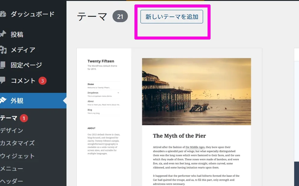 左メニュー「外観」→「テーマ」を選択し、「新しいテーマを追加」ボタンをクリックします