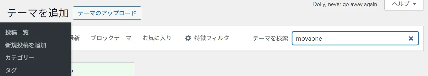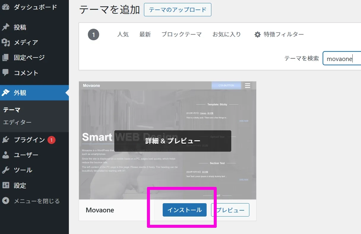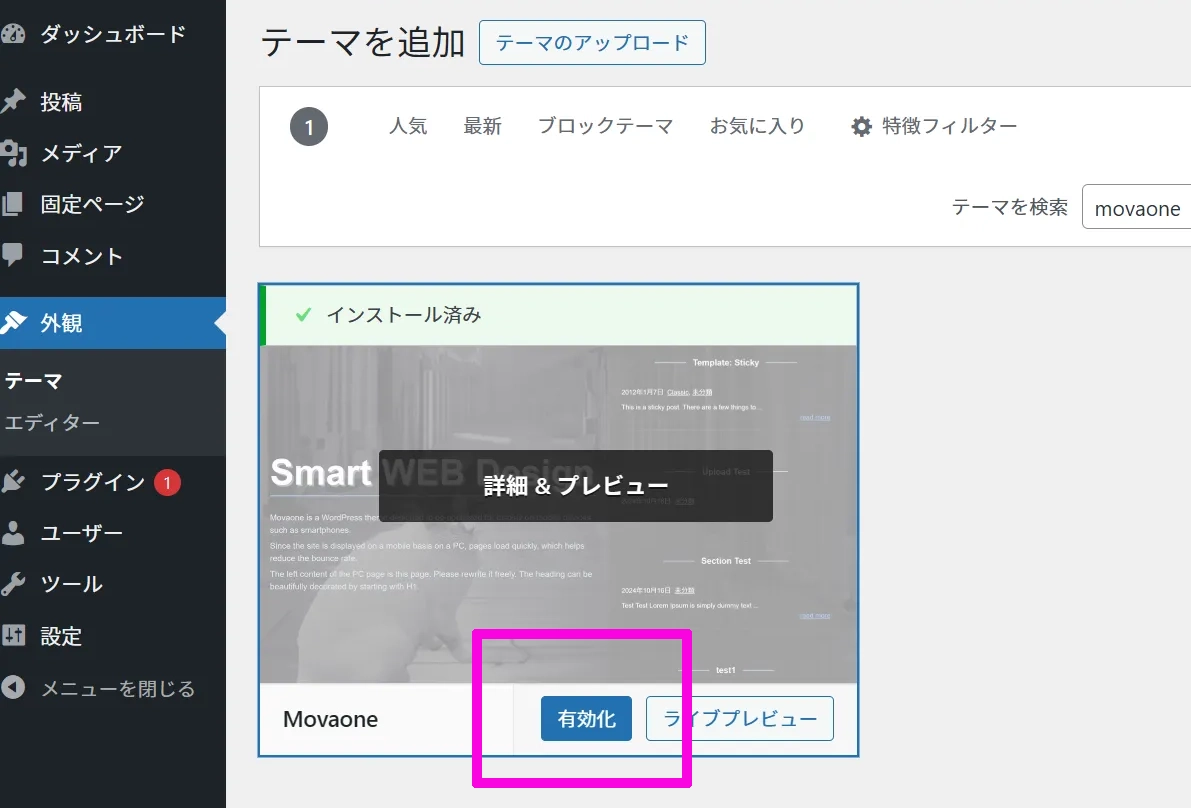 右上の「テーマを検索」フォームに、Movaoneと入力してキーボードをEnterします
