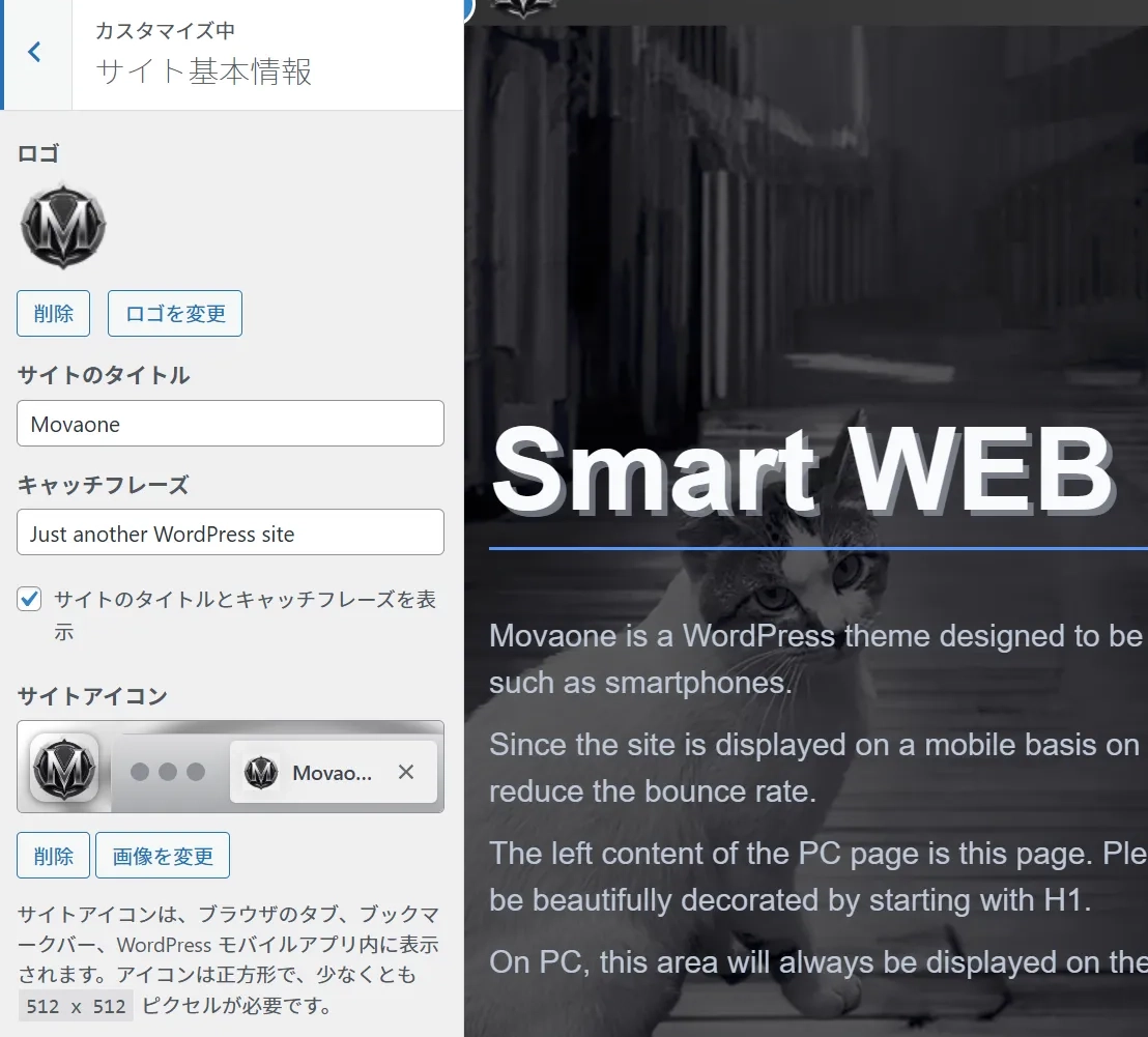 ヘッダーロゴ・サイトタイトル・サイトアイコンが設定できます。