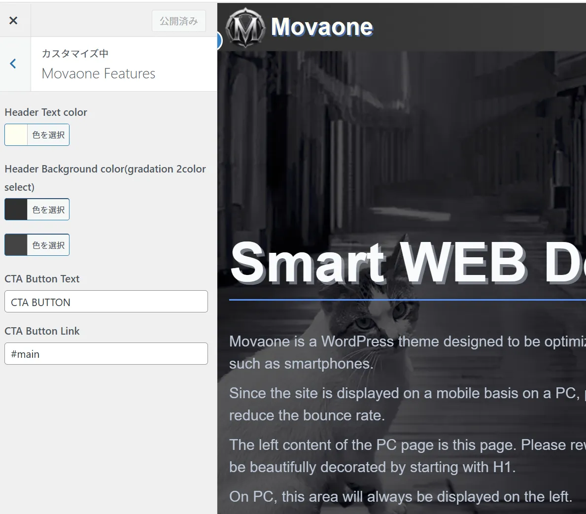 ヘッダーの背景色・リンク色と、CTAボタンのテキスト・リンク先が設定できます。