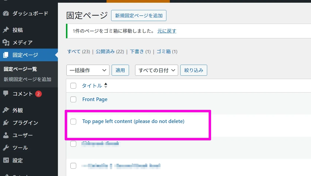 固定ページ一覧から一旦、「Top Page left content」をごみ箱に入れます。