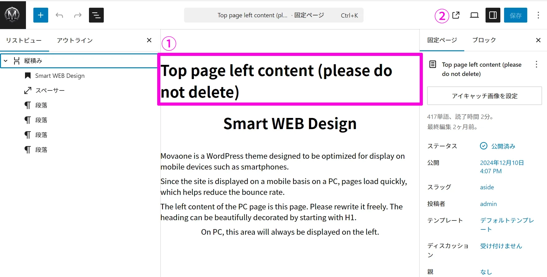 一番上の①「Top Page left content(please do not delete)」の部分は変更しないでください。