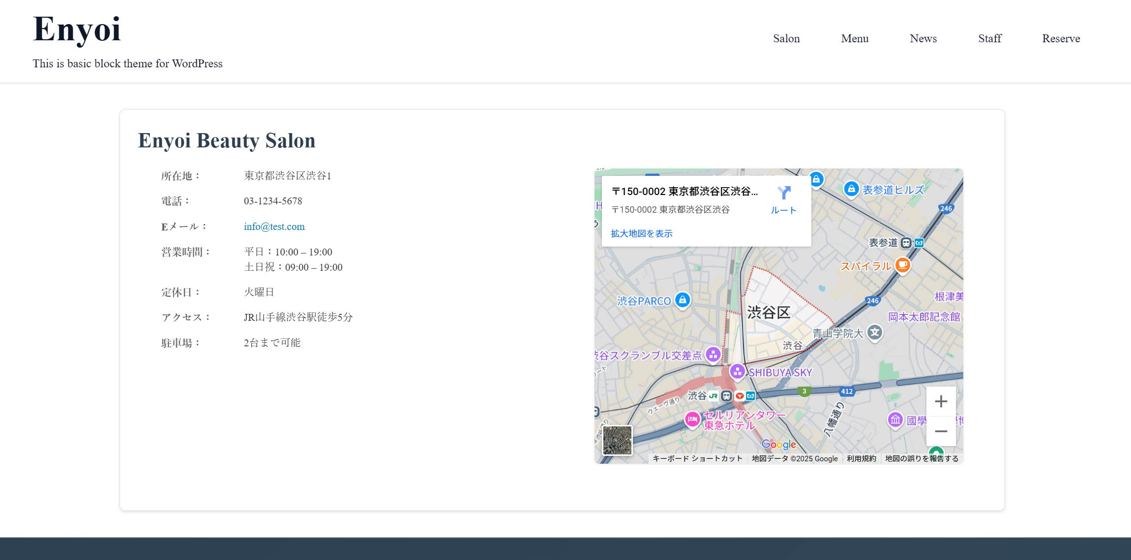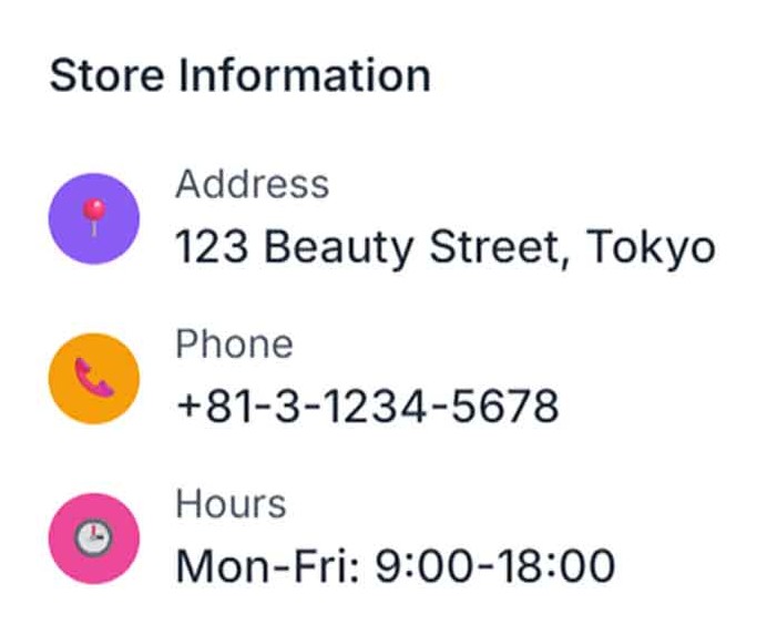 店舗名、住所、電話番号、電子メール、営業時間、休業日をすべて 1 つの整理されたブロックに表示します。