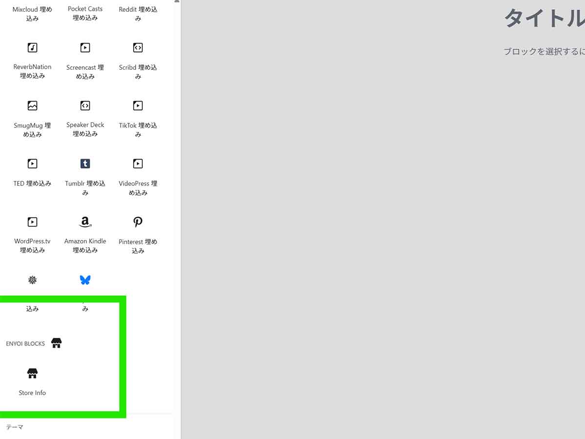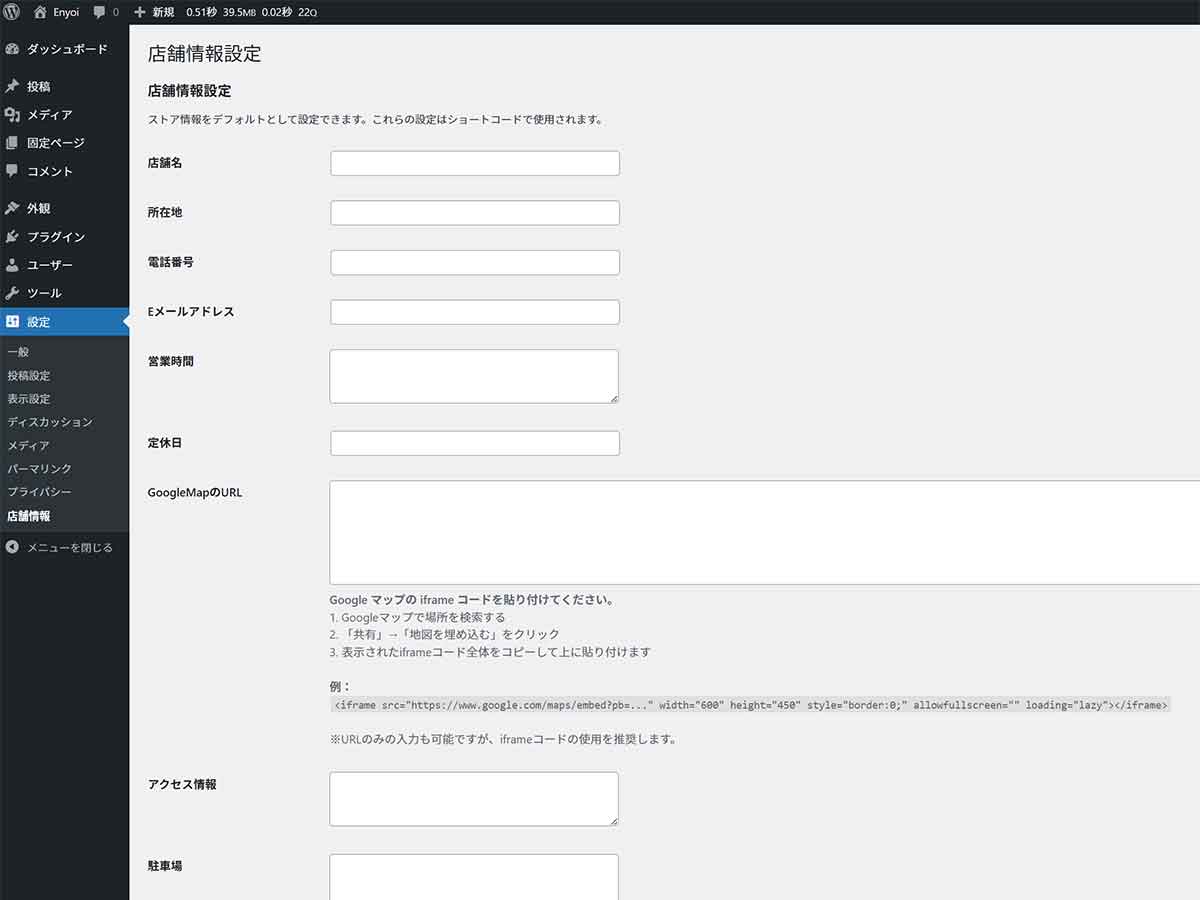 「設定」→「ストア情報」に移動して店舗の詳細を設定します。 投稿画面で、ブロックからEnyoi店舗情報を選び配置します。