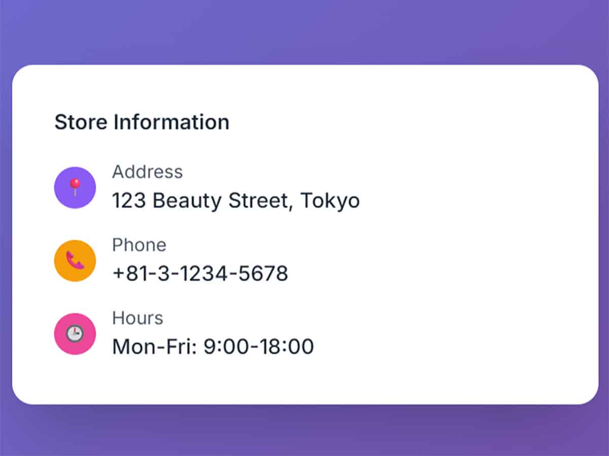 サロンの連絡先情報、営業時間、場所の詳細をシームレスに表示します。