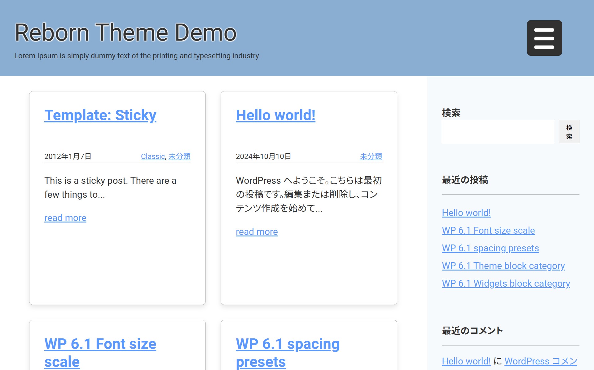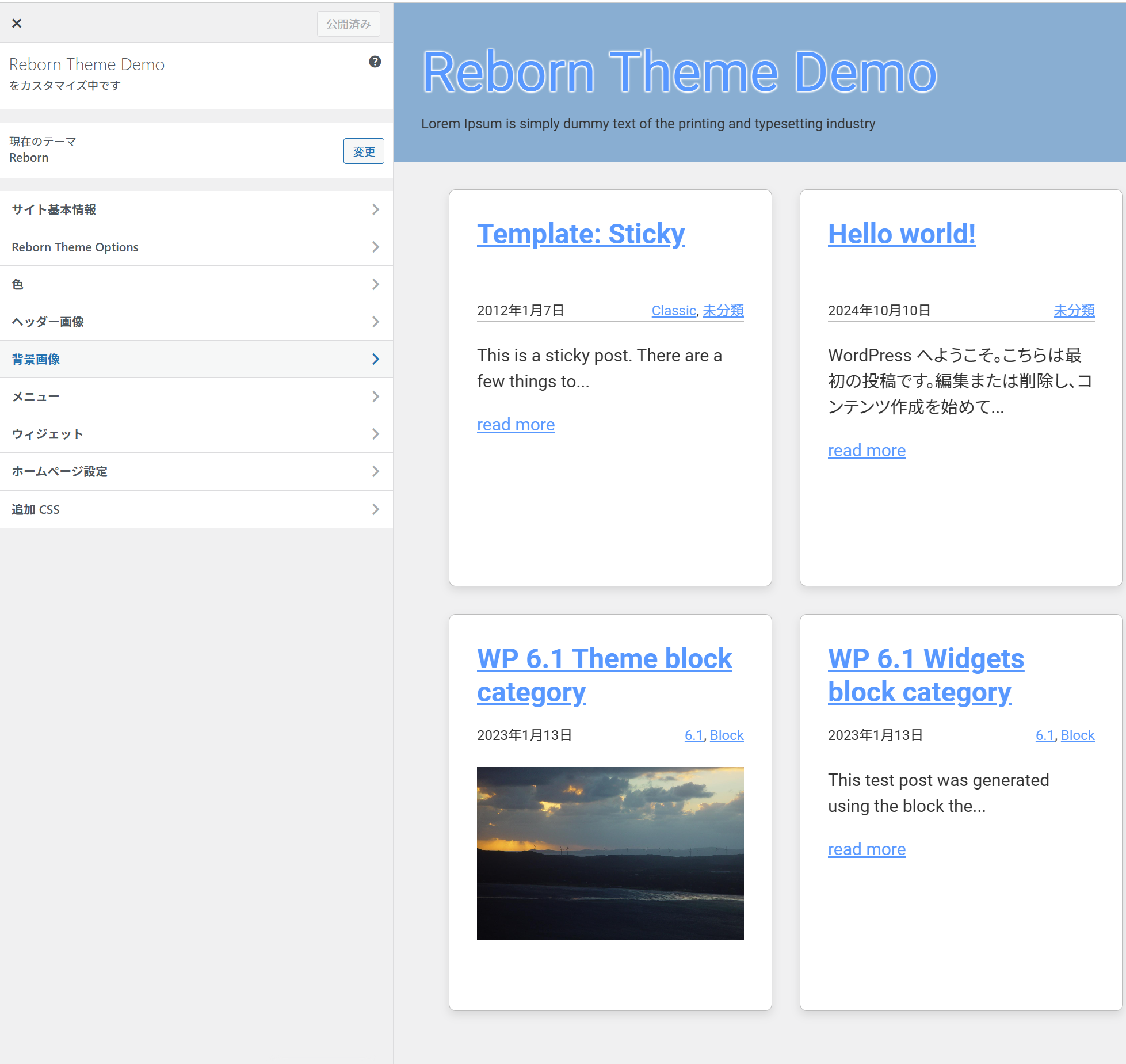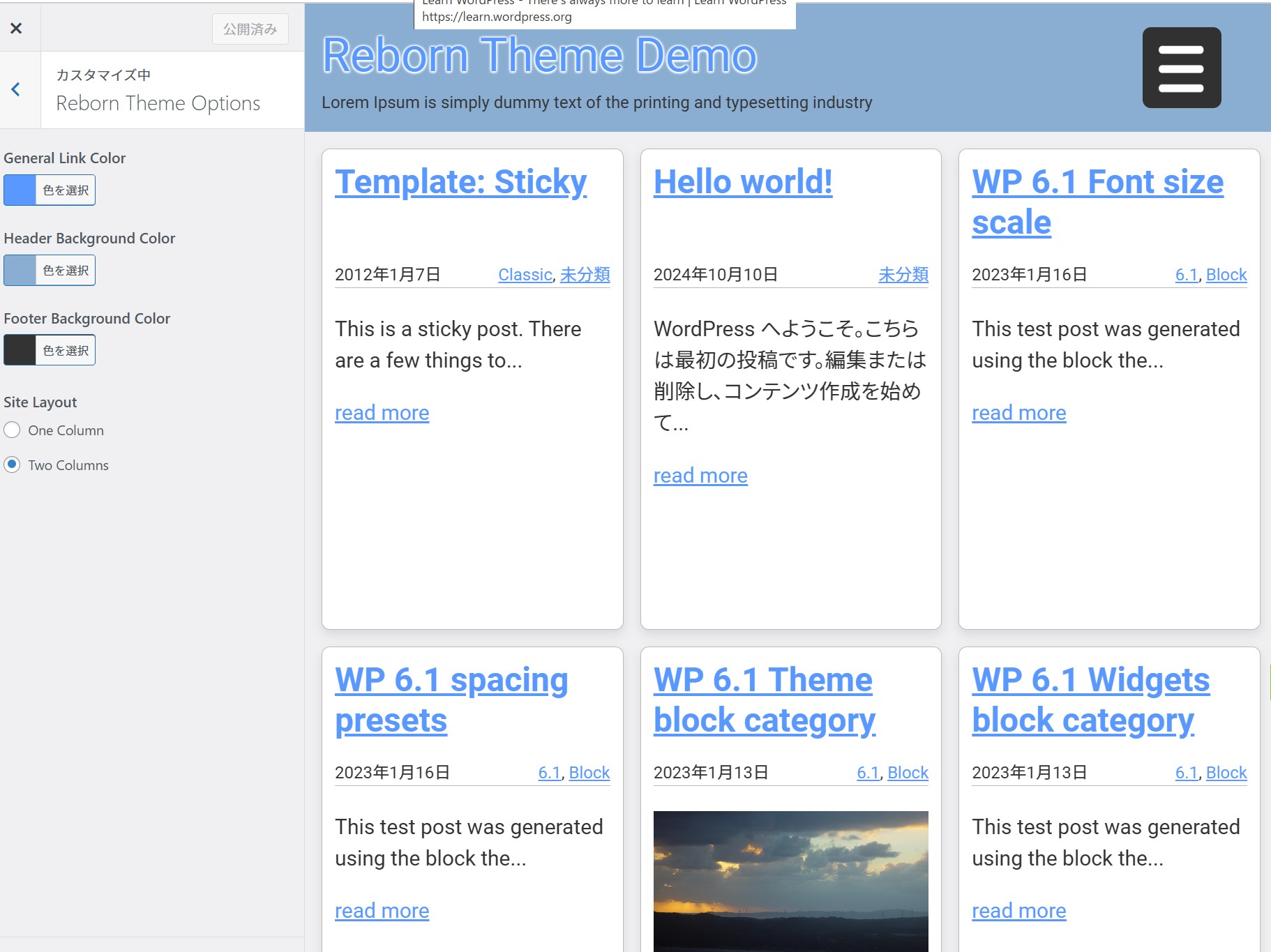 Rebornoはテスト開発やカスタマイズを目的としているため、カスタマイザーからの設定項目は最小限です。デザインの変更は、子テーマを作成し、CSSやテンプレートファイルを直接編集することを推奨します。